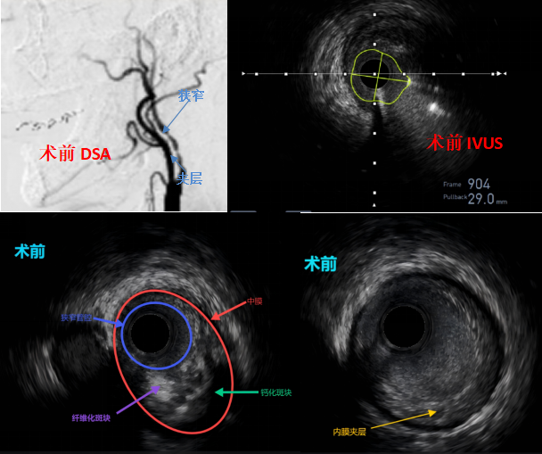就诊。经过详细的检查,诊断为右侧颈内动脉长节段闭塞,左侧颈内动脉C1段严重狭窄,脑血管造影发现左侧颈内动脉病变节段形态欠规则,似“糖葫芦”,不同于常见的动脉粥样硬化斑块形成病变。病变性质对颈动脉支架的成功植入以及远期的预防治疗均有重要意义,而传统的 DSA 较难准确判断病变性质,治疗方法存在一定风险,且难以保证支架植入的精准性。为了给患者提供更精准、有效的治疗方案,神经内一科介入团队经过充分讨论和评估,决定采用IVUS技术判断颈动脉狭窄原因,并在 IVUS 指导下进行颈内动脉支架植入手术。