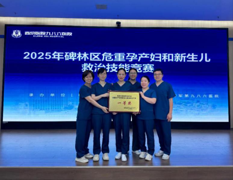 派出由产科张京京、薛宝瑶医生,胡兴菊、张钰护士,新生儿科刘红红医生以及麻醉科付华君医生组成的MDT团队参赛。队员们凭借精湛的专业技术、高效的团队协作和卓越的临场表现,在8支参赛队伍中脱颖而出,以总分第一名的优异成绩获得碑林区危重孕产妇和新生儿救治技能竞赛一等奖。