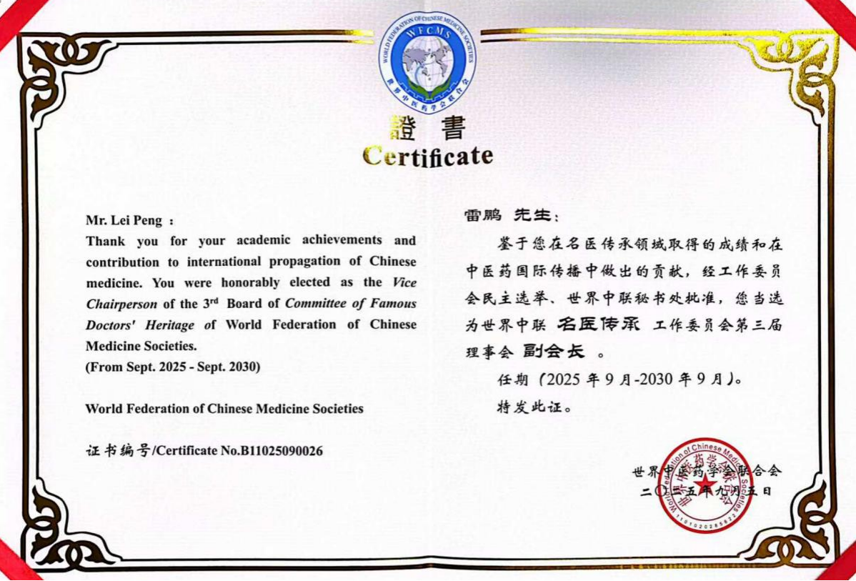世界中医药学会联合会是由国家中医药管理局主管的国家一级学会,长期致力于推进中医药的国际传播、学术交流与人才培养。名医传承工作委员会作为其重要分支机构,始终专注于名医学术经验的系统传承与创新发展。雷鹏主任作为陕西省名中医,长期致力于中西医结合临床实践与名医经验传承工作。此次当选副会长,既是对其个人学术贡献的肯定,也是对五楼自拍
