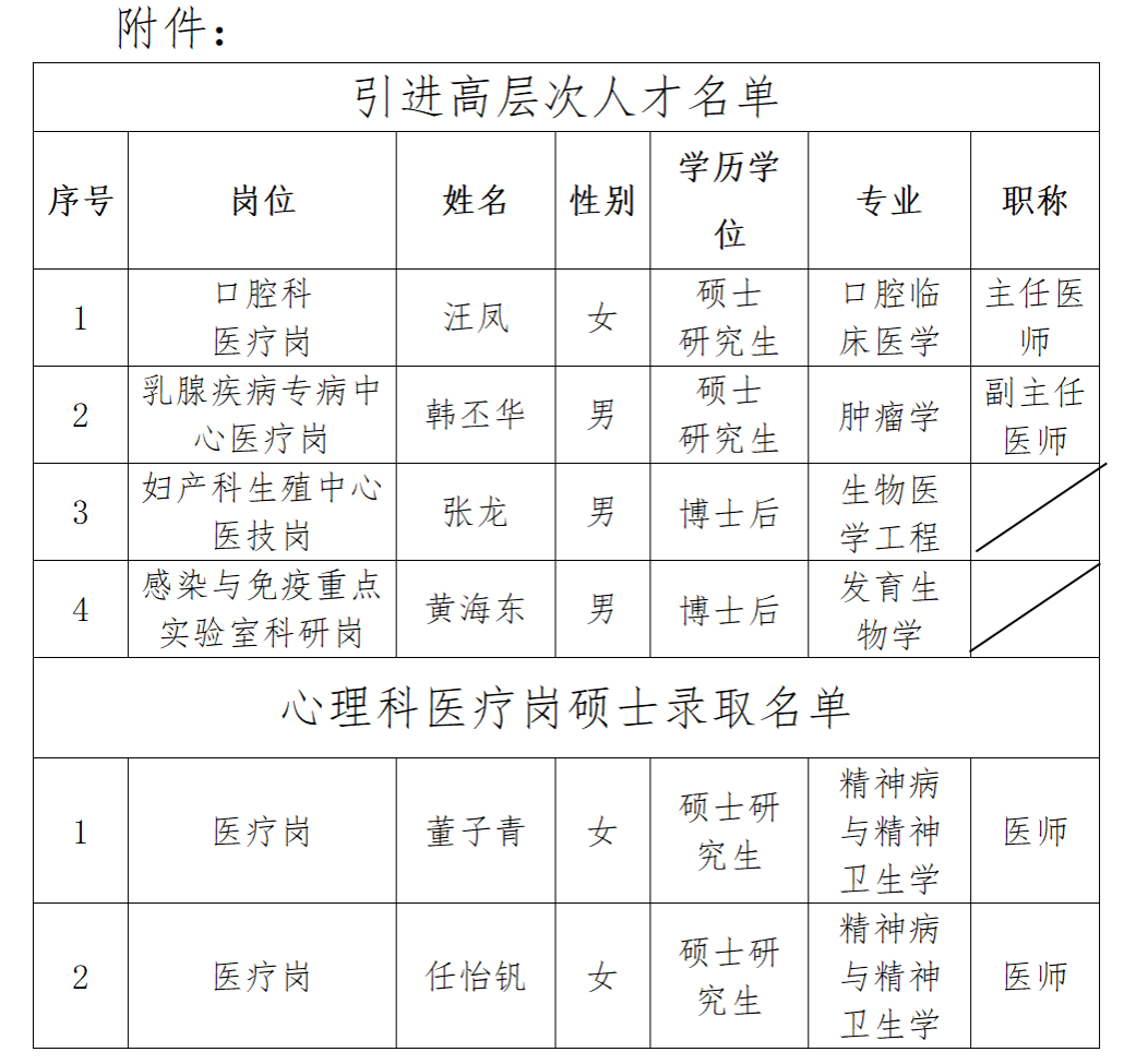 根据事业单位公开招聘工作有关规定,按照医院《2025年临床医技科室博硕士及高层次人才招聘公告》,结合医院学科和业务发展需要,经前期报名、资格审查、面试等程序,拟引进汪凤等高层次人才4人、心理科医疗岗硕士董子青等2人到五楼自拍 工作。现予以公示。