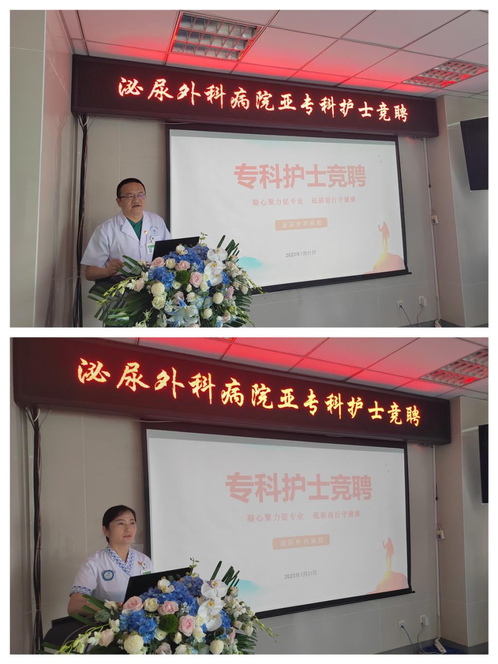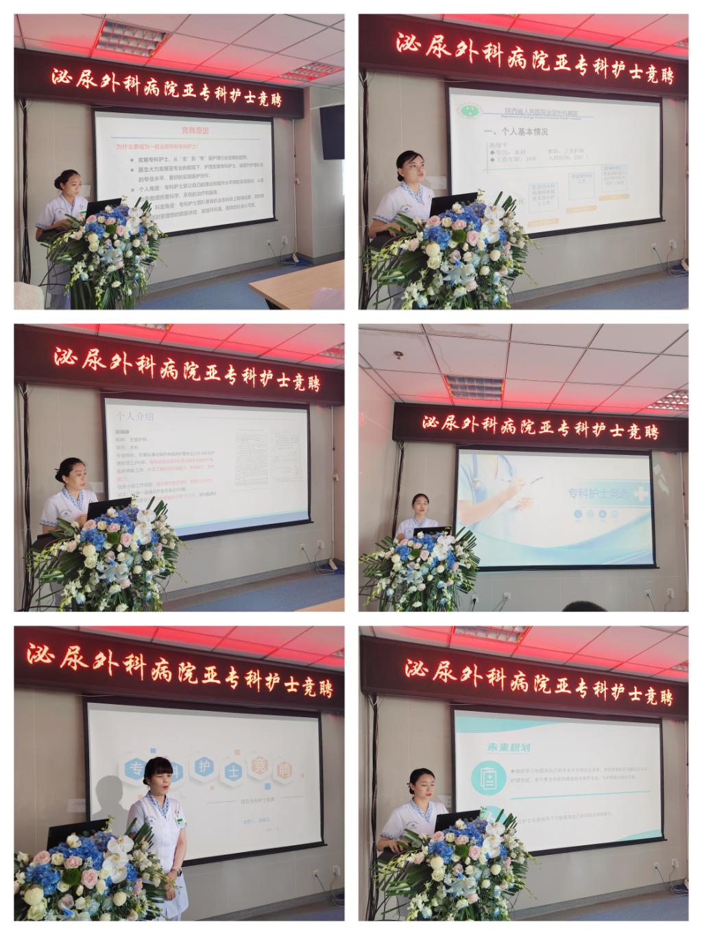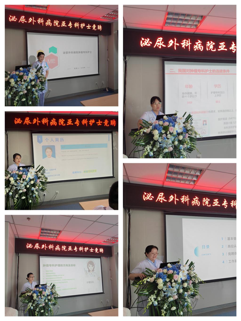孙羿主任肯定了护士在患者疾病诊疗过程中的作用,同时提出专科护士的发展方向和要求。泌尿外科病院高度重视护士亚专科发展,在临床亚专科划分的基础上,筹备亚专科护士的培养,先后通过自愿上报、科室遴选、竞聘汇报等三个阶段遴选专科护士。本次护士竞聘肿瘤亚专科、前列腺亚专科及结石亚专科,各位候选人根据自身亮点,运用数据、照片、图表等方式展开汇报,充分展示了各专科护士的自身实力和专业水平。经过激烈角逐,最终评选出前列腺专科护士闫锐、肿瘤专科护士郑灿、结石专科护士赵晓静。