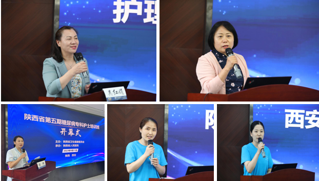 开幕式上,吴红娟主任对各位学员的到来表示诚挚的问候与热烈的欢迎,对医院及护理学科优势做简要介绍,强调“十四五”时期加快专科护理人才培养对全面推进健康中国建设意义重大,期望学员珍惜学习机会,拓宽思维,学以致用,努力提高专科护士综合能力。李小凤主任表示,糖尿病专科护理队伍在糖尿病管理中发挥着重要作用,专科护士作为与医生、患者都有紧密联系的重要角色,将在糖尿病教育管理工作中发挥不可取代的作用。随后,陕西省中医医院张瑾、西安市人民医院来欣作为学员代表发言,她们表示充分认识到专科护士在临床护理中发挥的重要性,必将珍惜学习机会,勤学善思,知行并进,将学习成果带回单位,为推进医院专科护理发展不懈奋斗。