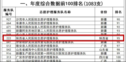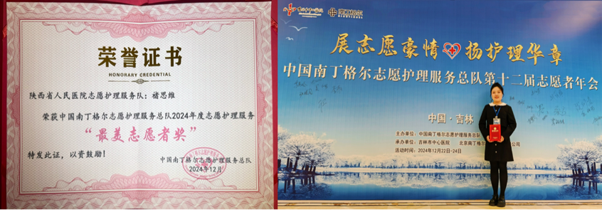 志愿护理服务队表现亮眼,年度综合数据跻身全国前100 名,陕西省仅两家医院获此殊荣。同时,志愿队员褚思维脱颖而出,荣获“中国南丁格尔最美志愿者奖”。
