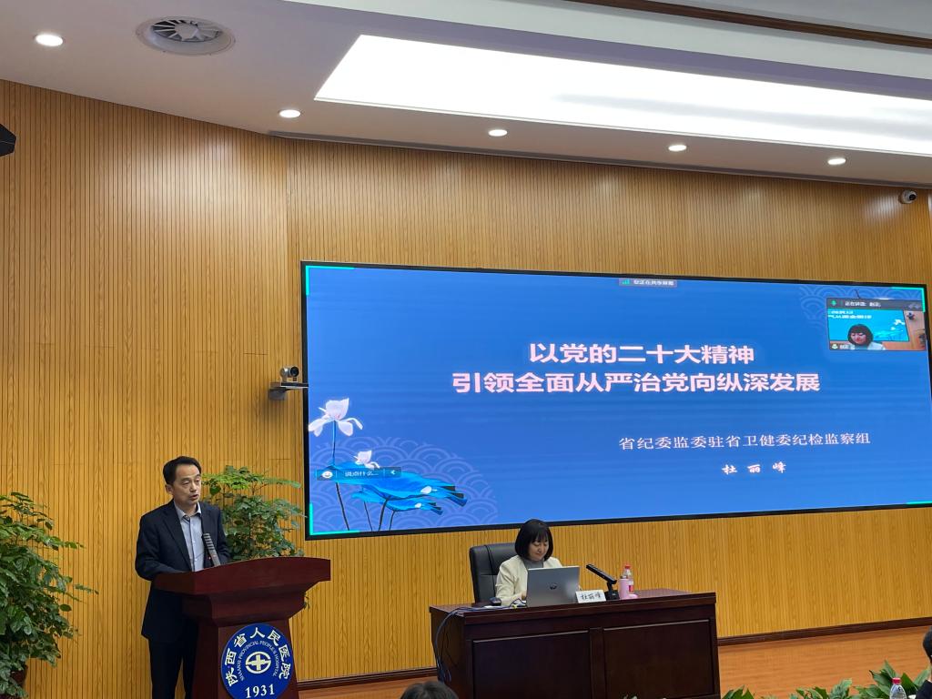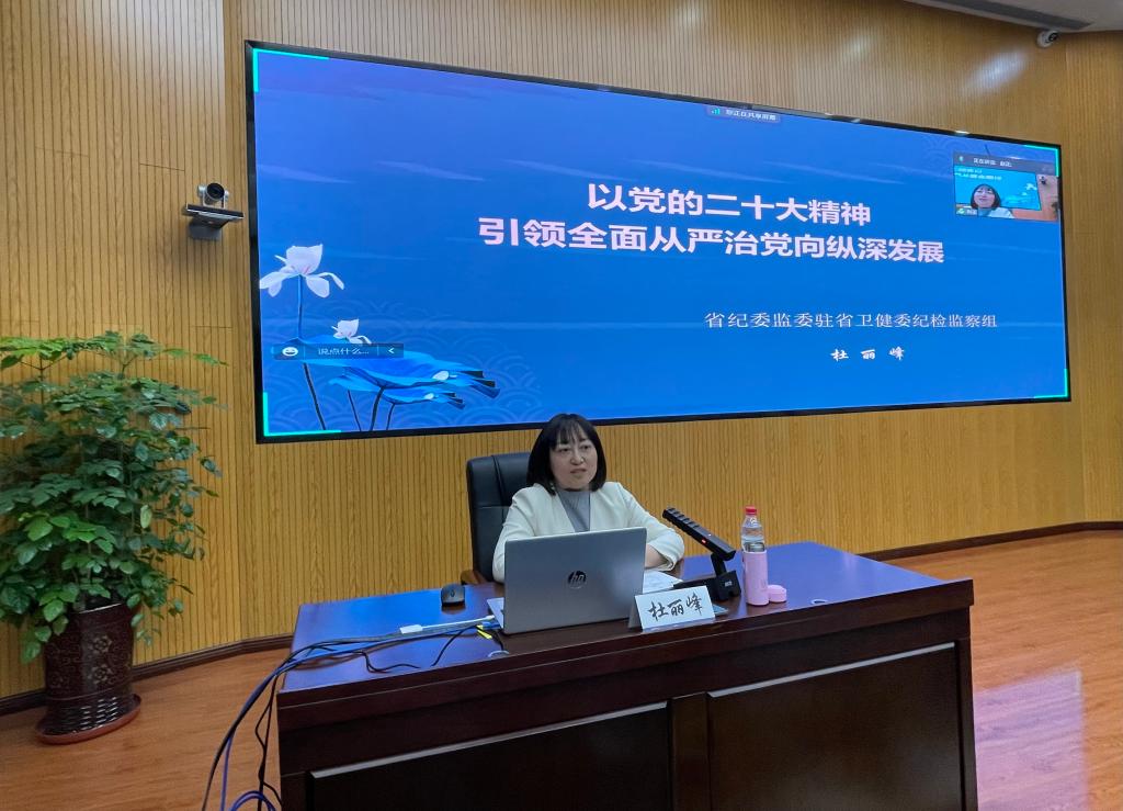 邀请省纪委监委驻省卫生健康委员会纪检监察组副组长杜丽峰来院进行授课辅导。在院党委班子成员、医院中层干部、各党支部书记、纪检委员分别以线上、线下的形式参加了授课辅导。