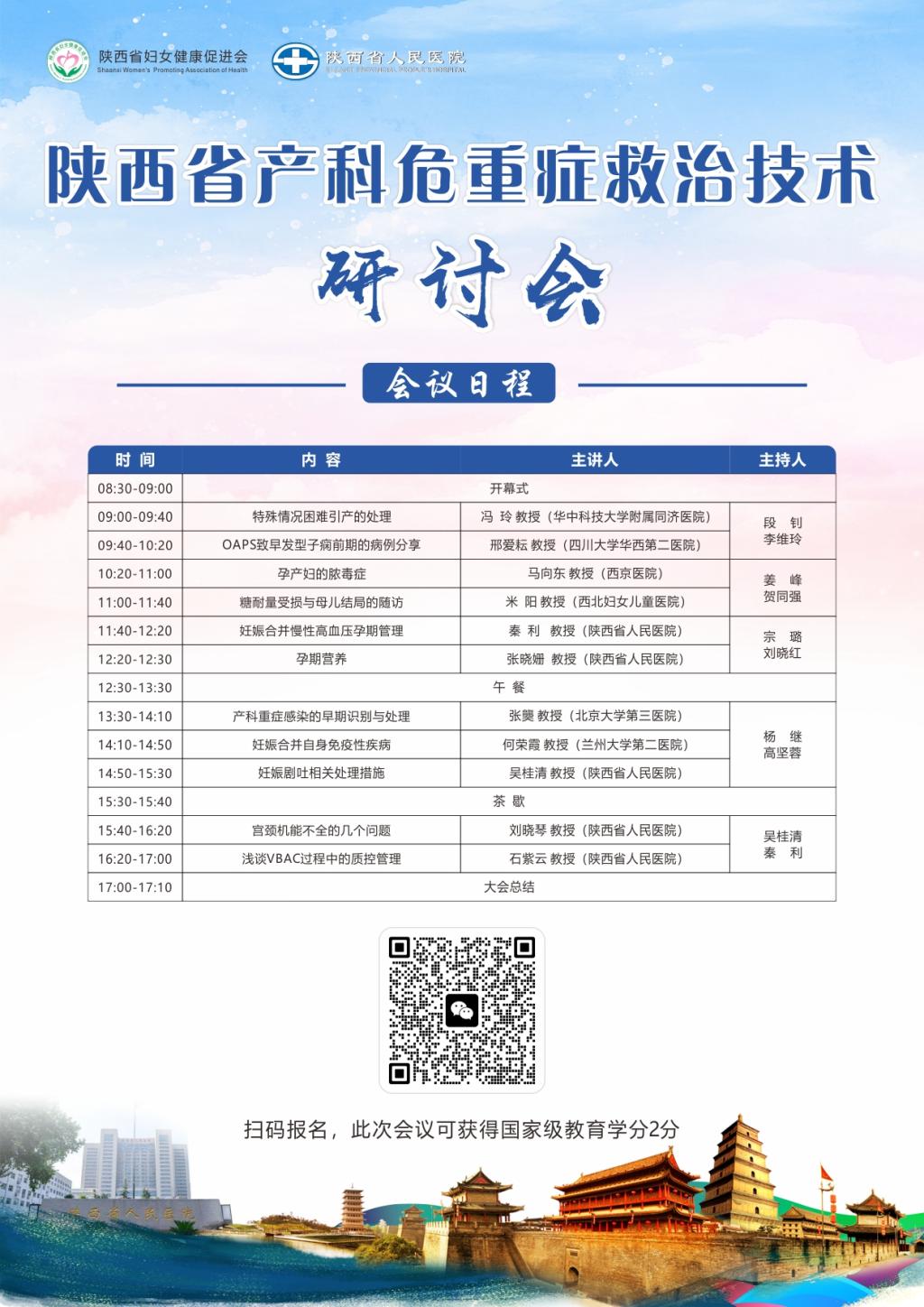 主办,于2023年3月25日举办陕西省产科危重症救治技术研讨会,围绕产科感染、特殊情况困难引产的规范化管理、妊娠合并自身免疫性疾病等热点问题进行研讨。届时将邀请北京大学第三医院张龑、华中科技大学附属同济医院冯玲、四川大学华西第二医院邢爱耘、兰州大学第二附属医院何荣霞等国内省内知名专家授课与研讨。会议安排如下: