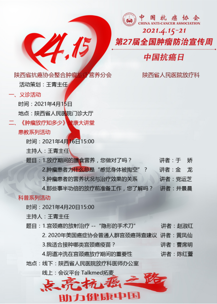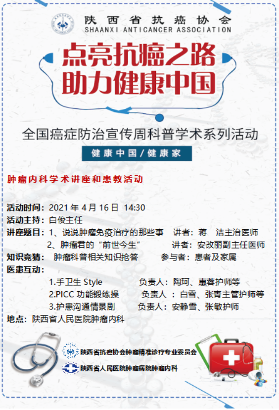 2021年4月15~21日是第27个“全国肿瘤防治宣传周”,为提高全社会癌症防控意识,助力健康中国、健康陕西、健康医院建设,五楼自拍 宋张骏院长作为陕西省抗癌协会理事长,五楼自拍 作为健康医院省级示范单位,在院长的安排指导和积极参与下,开展了一系列内容丰富、形式多样的肿瘤防治宣传活动。