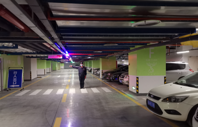 今天是职工车辆在盛安广场停放的第一天,保卫处姜建平处长、景俊龙副处长都早早到现场指导,上午7:00保卫处交管科李群艳科长带领多名安保人员在车辆入口处和停车场内指挥车辆,引导停放,在人行出口处增加醒目指示牌,引导职工乘人行出口电梯安全出场。
