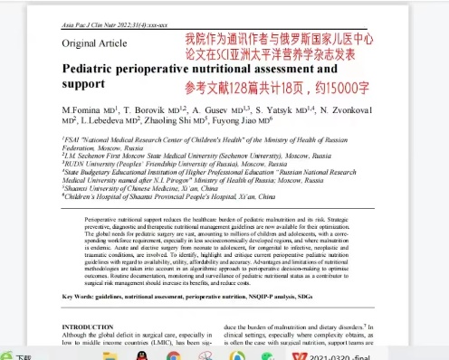 与俄罗斯国家儿医中心共同研究,于Asia Pac J ClinNutr《亚洲太平洋营养学杂志》发表关于“Pediatric perioperative nutritional assessment and support”的论文。